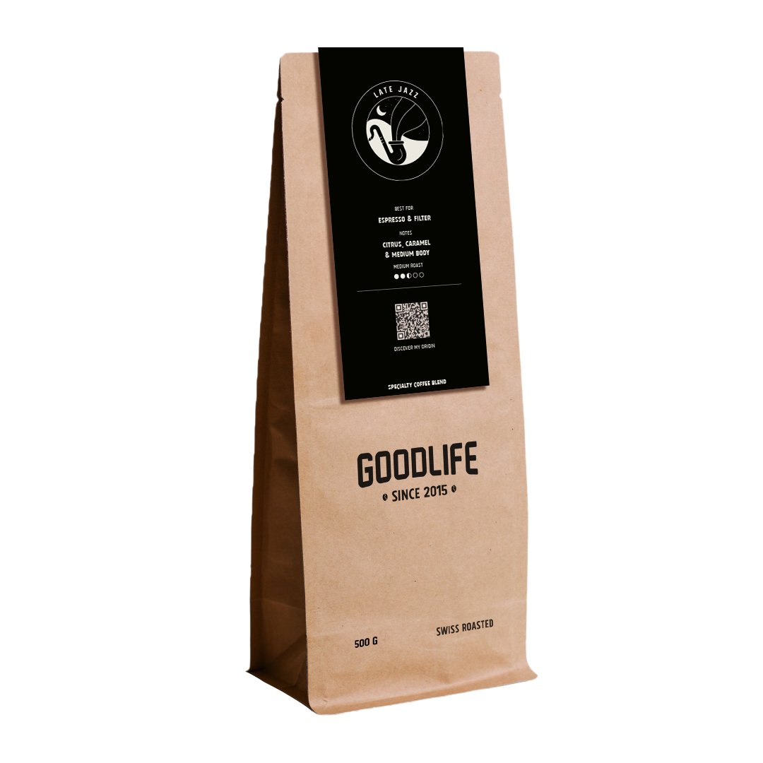 The evening coffee, a summer night, a few notes of saxophone, we imagined our Late Jazz as well. A subtle blend of our Colombian decaffeinated coffee, decaffeinated without chemical solvents, preserving its fruity, sweet aromas, balanced by our Kenyan Peaberry and its citrus notes. The result is a semi-decaffeinated blend, ideal for a tasty end to the day, or if your dinner is followed by a jazz concert...